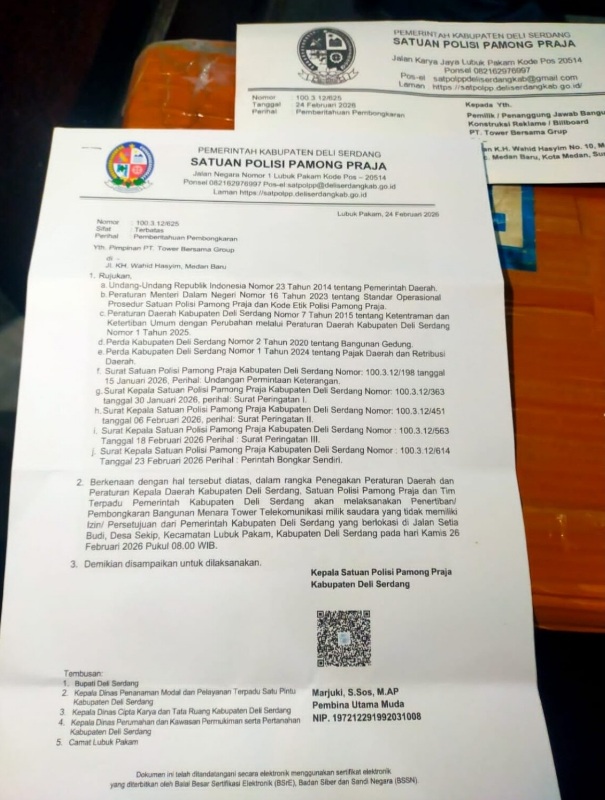 RakyatPost.id, Deli Serdang,– Pemerintah Kabupaten Deli Serdang melalui Satuan Polisi Pamong Praja melakukan pembongkaran Tower Seluler milik PT Tower Bersama Infrastucture Terbuka (TBIG) di Jalan Setia Budi Desa Sekip Kecamatan Lubuk Pakam kamis,(26-02-2026).