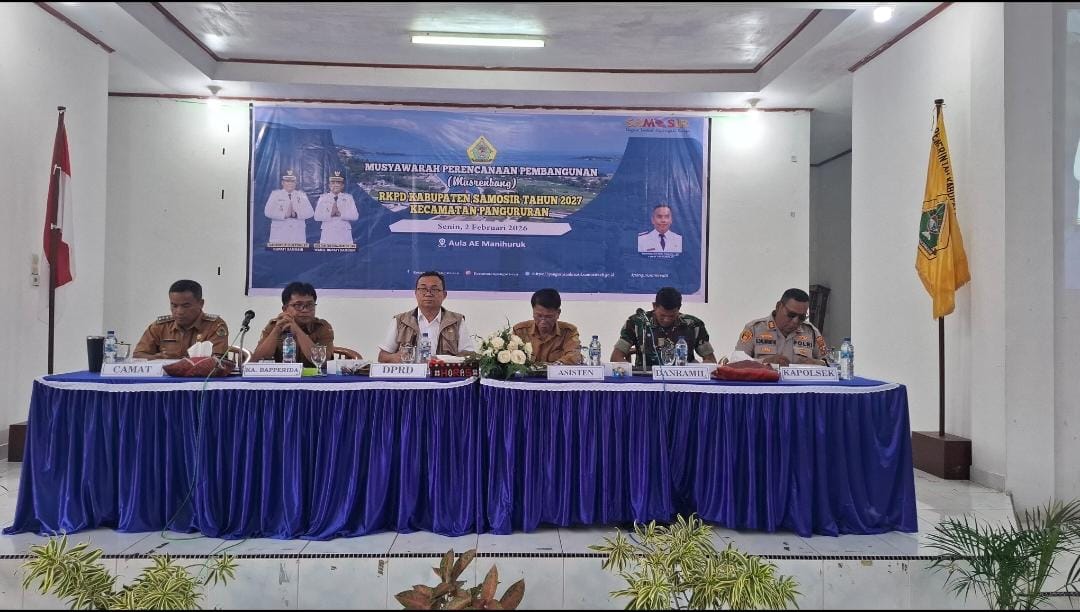 RakyatPost.id, Samosir, – Pemerintah Kabupaten Samosir melalui Bapperida menggelar Musyawarah Perencanaan Pembangunan (Musrenbang) Rencana Kerja Pemerintah Daerah (RKPD) Tahun 2027 Tingkat Kecamatan Pangururan. Musrenbang ini berlangsung di Aula AE Manihuruk dan dihadiri oleh berbagai pihak, termasuk Asisten I Tunggul Sinaga, Rinaldi Naibaho DPRD Dapil I, Kepala Baperinda, Camat Pangururan, Danramil Pangururan, Kapolsek Pangururan, para Kepala Desa, Pendamping Desa, Kepala Sekolah, Tokoh Masyarakat, Tokoh Agama, serta masyarakat, Senin (2/2/2026).