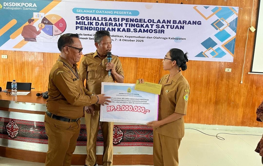 RakyatPost.id, Samosir, – Dinas Pendidikan, Kepemudaan, dan Olahraga (Disdikpora) Kabupaten Samosir bersama PGRI Kabupaten Samosir menyerahkan bantuan sosial kepada guru dan siswa korban kebakaran di penghujung kegiatan Sosialisasi Pengelolaan Barang Milik Daerah Tingkat Satuan Pendidikan Kabupaten Samosir pada 7 Oktober 2025. Bantuan ini merupakan bentuk kepedulian dan dukungan kepada mereka yang terdampak musibah kebakaran.