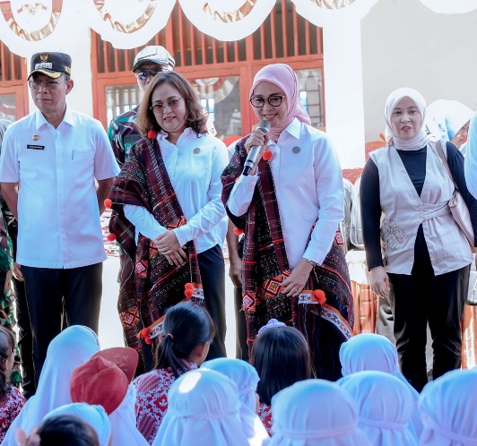 Ketua TP PKK Provinsi Sumut Kahiyang Ayu, didampingi Staf Ahli I Titiek Sugiharti, bersama Pengurus SERUNI KMP Bidang V Rustini Muhaimin dan Mutiara Mugiyanto, tampak berinteraksi hangat dengan anak-anak melalui permainan, canda, dan nyanyian.