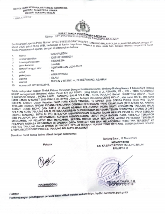 Nashruddin resmi melaporkan kejadian itu ke Polres Tanjungbalai dengan Surat Tanda Penerimaan Laporan Nomor STTLP/B/73/III/2026/SPKT/RES T.BALAI/POLDA SUMUT tertanggal 12 Maret 2026.