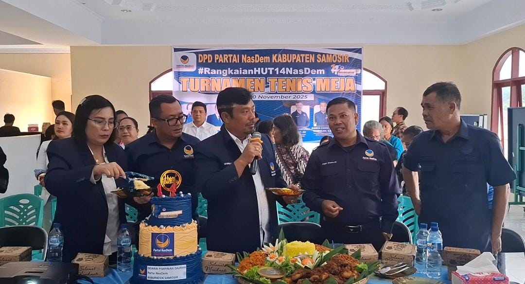 RakyatPost.id, Samosir – DPD Partai NasDem Kabupaten Samosir merayakan Hari Ulang Tahun (HUT) ke-14 Partai NasDem dengan penuh semangat dan komitmen. Perayaan ini berlangsung di Wisma Ompu Rimdo Jalan Rianiate Kilometer 5,7 Hutanamora, Kecamatan Pangururan, Selasa (11/11/2025).