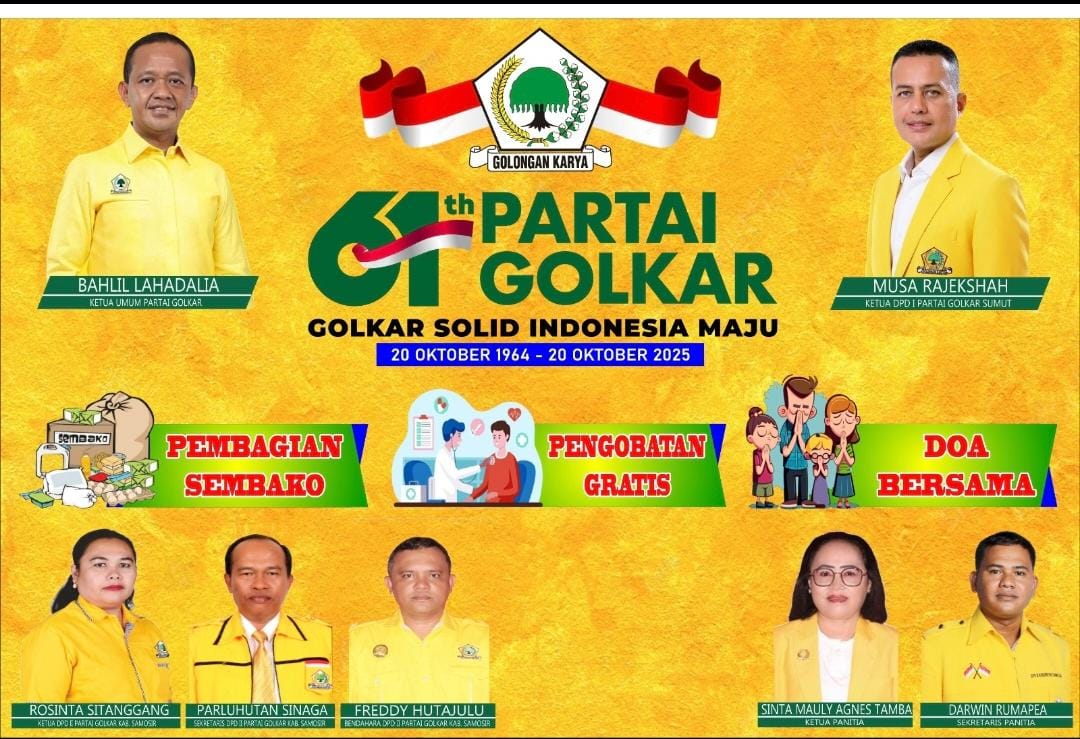 RakyatPost.id, Samosir,- DPD Partai Golkar Kabupaten Samosir akan menggelar rangkaian kegiatan dalam rangka memperingati Hari Ulang Tahun (HUT) ke-61 Partai Golkar yang pelaksanaannya dimulai pada 9 Oktober sd 20 Oktober 2025.